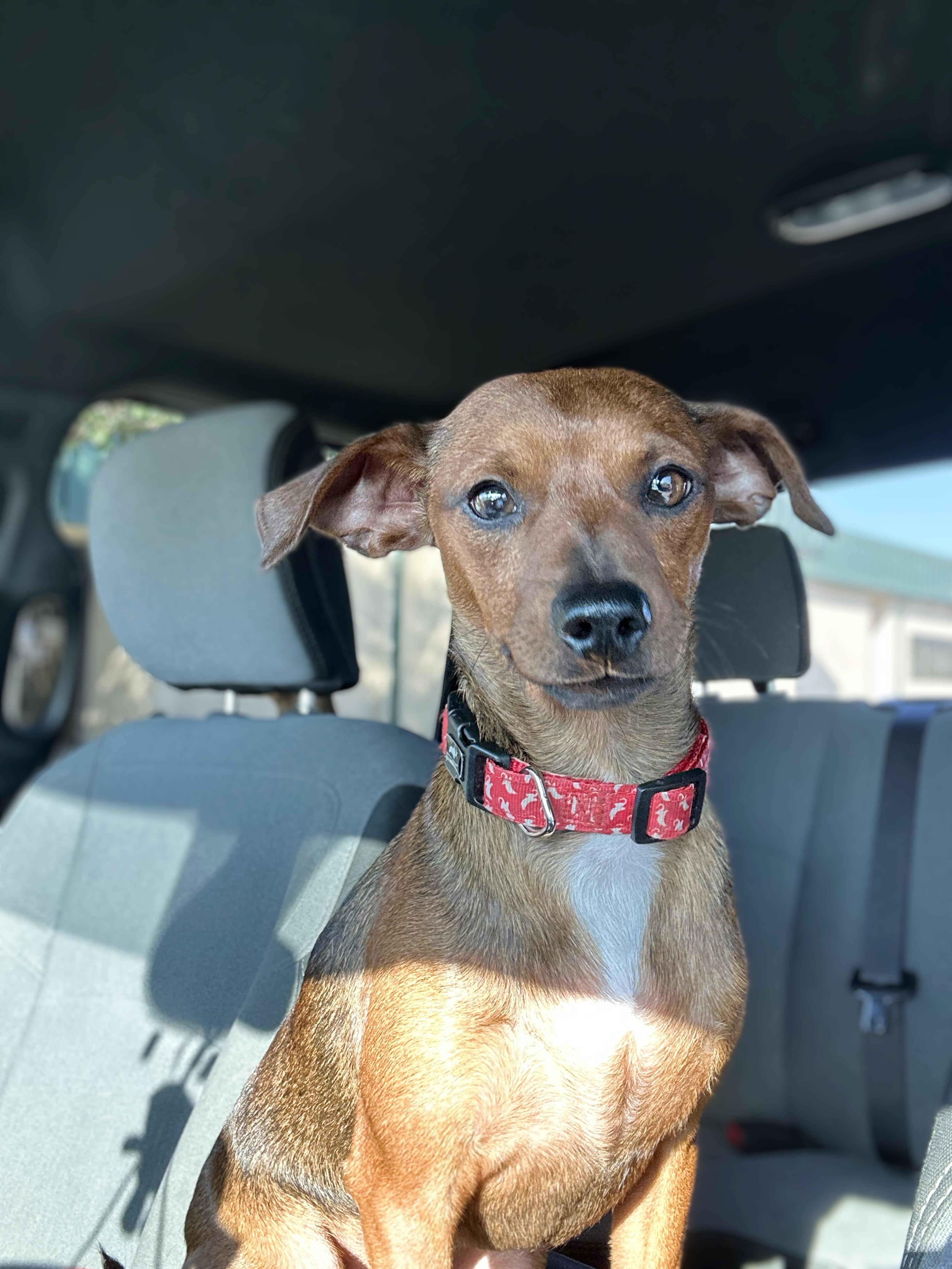 This sweet 4 year-old lap baby ready to find his forever home! Thomas is the ultimate lovebug — he gives the gentlest kisses, “talks” to you with little whines, and just wants to be close to his person. At only 11.8 pounds, he’s the perfect size to carry, cuddle, and take anywhere! He’s not alpha, not territorial — just soft-hearted, easygoing, and incredibly gentle. He looks like a Chihuahua/Min Pin mix and LOVES to be held. His favorite spot- riding shotgun as your middle-console co-pilot.