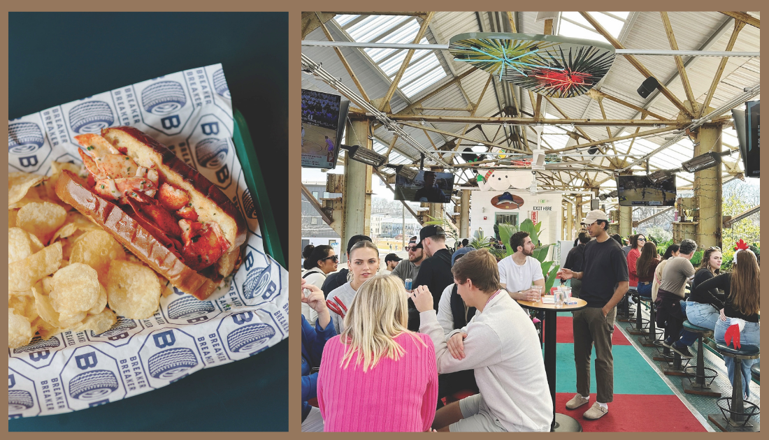 True Headliner: The lobster roll comes with house-made chips, left. People enjoy cocktails at the the rooftop lounge, right. Photo credit: Breaker Breaker