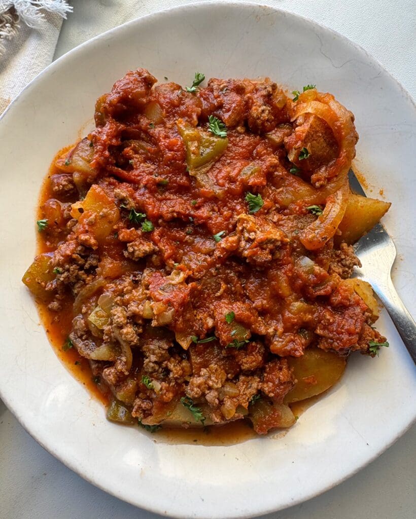 - Author’s updates: added garlic powder and dried thyme, diced potatoes, sautéed onion/pepper with beef, and used pasta sauce.