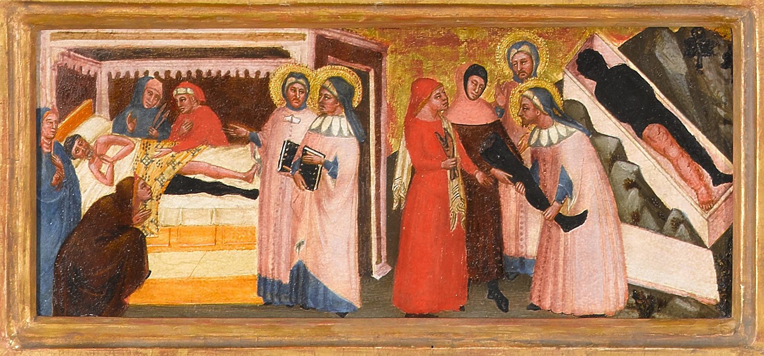 Consisted of picture: Wonder of the Black Leg (information), Master of the Rinuccini Church (Matteo di Pacino), Saint Cosmas and Saint Damian, c. 1370– 75, tempera and gold dropped leave on panel, 79 4 x 135 6 centimeters/ North Carolina Gallery of Art, Raleigh