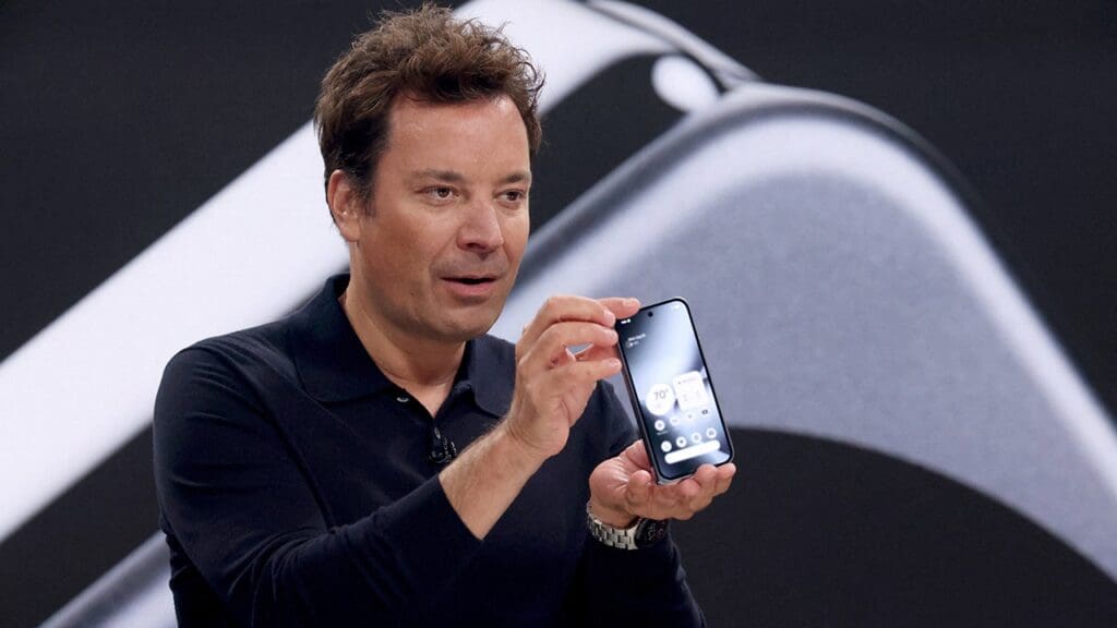 Host Jimmy Fallon holds Pixel 10 Pro Fold mobile phone during the “Made by Google” event, which introduced the latest additions to Google’s Pixel portfolio of devices, in Brooklyn, New York, Aug. 20, 2025. (REUTERS/Brendan McDermid)