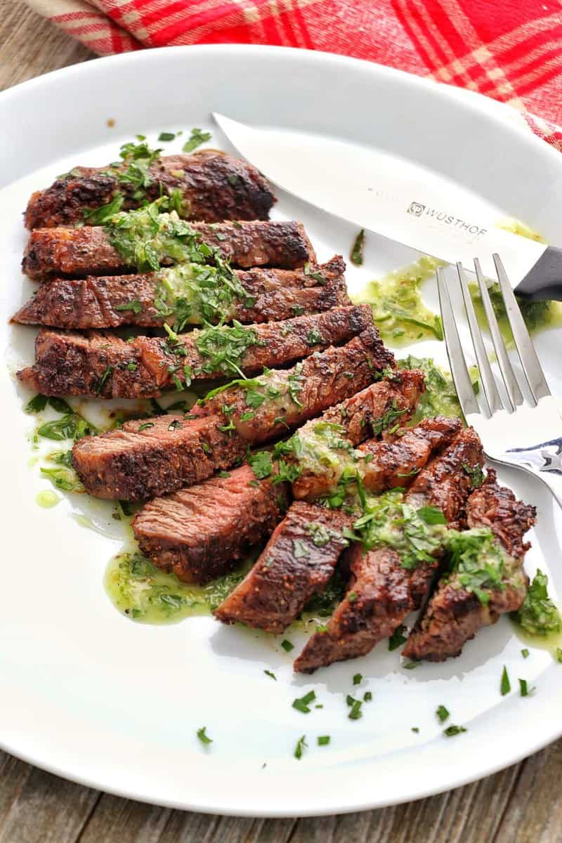 Sliced grilled steak topped with green herb sauce on a white plate.