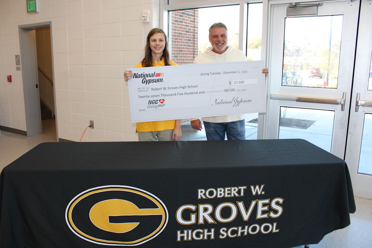 - National Gypsum Company donated $27,500 to support Groves High Schoolās CTAE programs as part of its Giving Tuesday initiative.