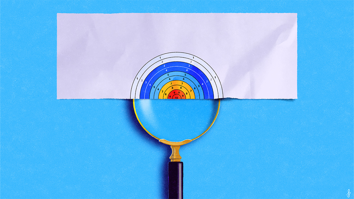 Magnifying glass revealing a colorful target.