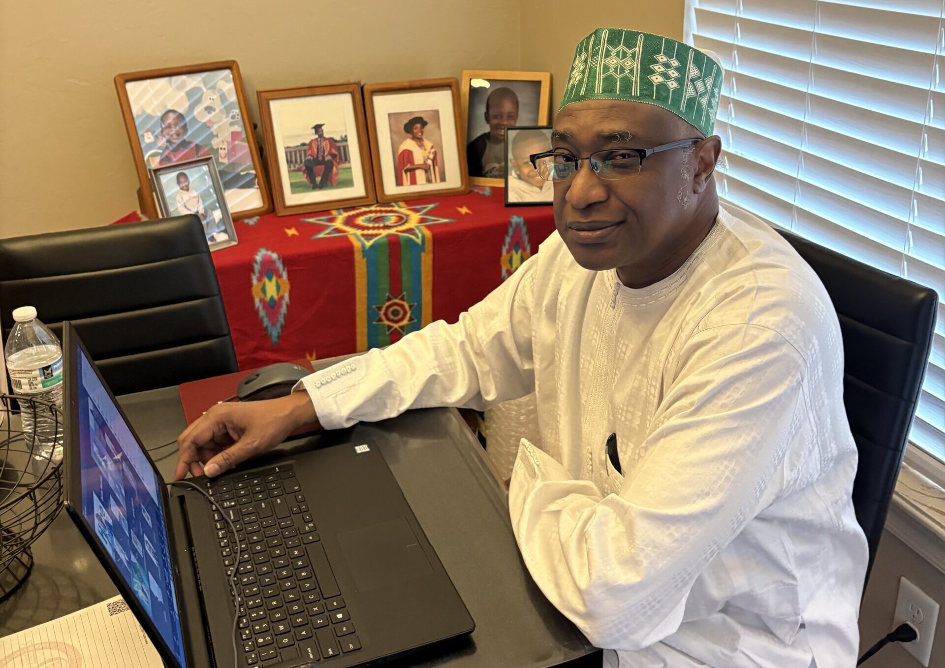 Dr. Mambula sits at his desk wearing traditional Nigerian clothes