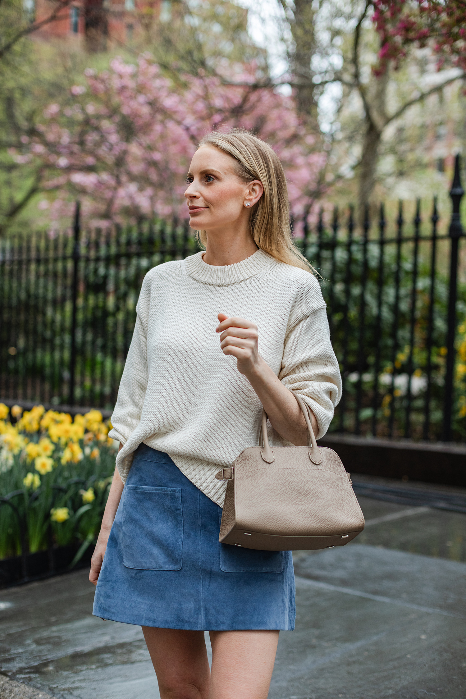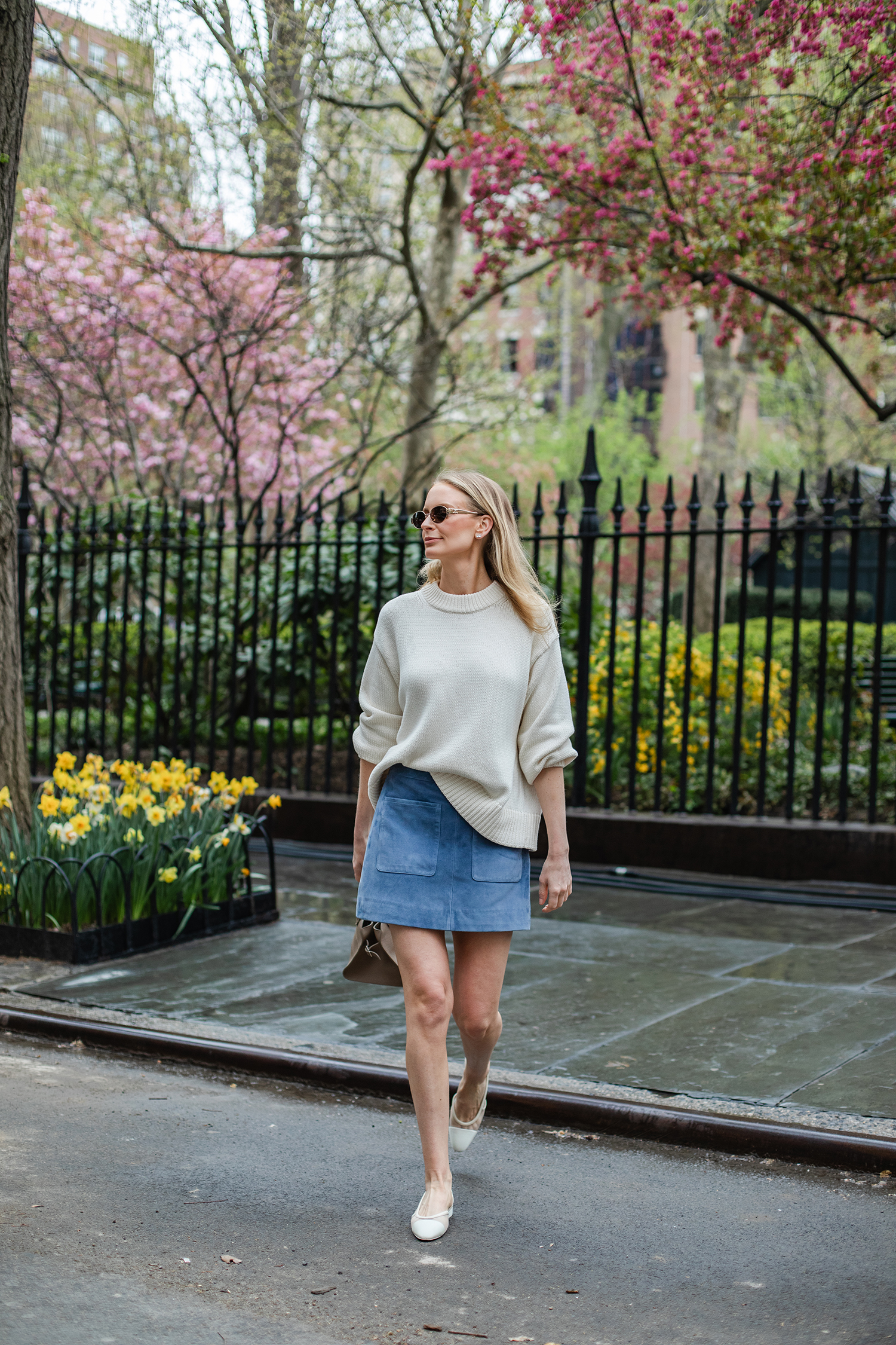 PS: You might not think a blue suede miniskirt would be that useful, but I’ve worn it quite a lot since I purchased it this winter! I’ve styled it with turtlenecks/bodysuits, boots and tights for drinks dates when the temps were frigid, but now I’m loving pairing it with lighter knits like this short sleeve cardi and this chunky cotton pullover for spring. It’s perfect for elevated brunch and lunch plans, casual dinners, and really most social plans I have these days! I have to admit I haven’t worn the matching jacket as much as I thought I might, but the skirt was definitely a worthy purchase. I’m hopeful I’ll find the jacket more useful once the temps dip again after this unexpected heat wave New York has been having! We went from freezing temps to the 80s in a snap, but it’s back to the 50s and 60s for a bit.