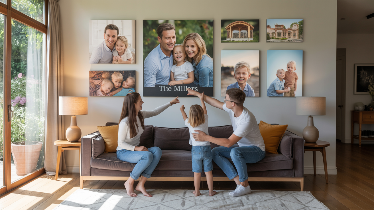 Multi-generational displays showcase family history and connection across time periods. Coordinated canvas presentations of grandparents, parents, and children create powerful visual statements about family continuity and shared heritage.