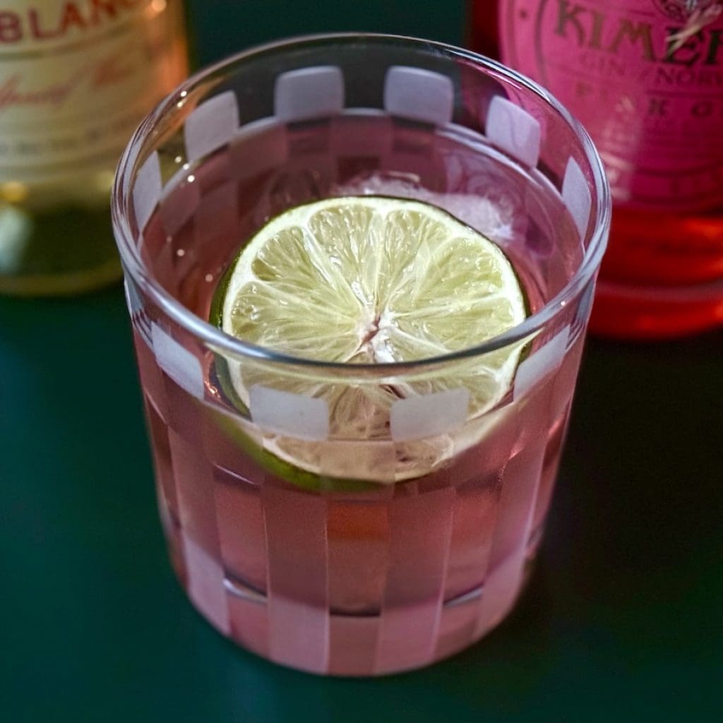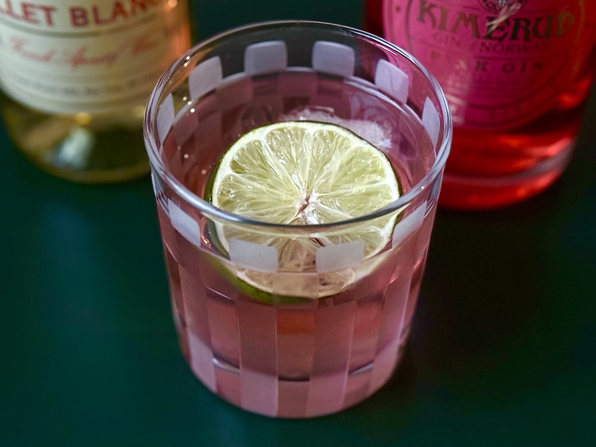 - Simple three-ingredient build: equal parts pink gin, dry vermouth, and Lillet Blanc, stirred over large ice.