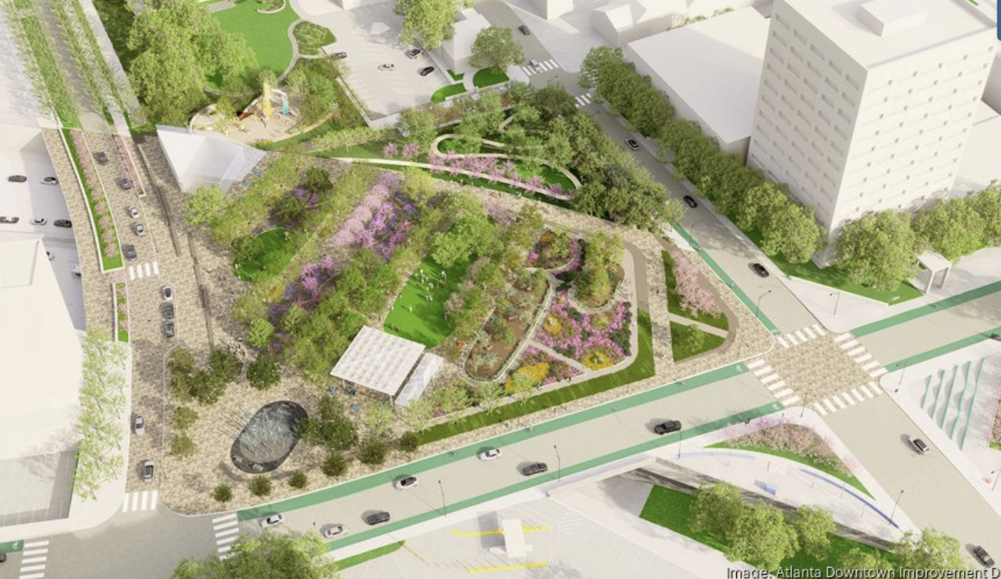 CAP unveiled renderings for the retooled initial phase of The Stitch project, showcasing features of the ¾-mile platform above the I-75/85 connector, including a performance and shade pavilion, interactive water fountain with “fog forest” capabilities, a large playground, gardens, and other social spaces.