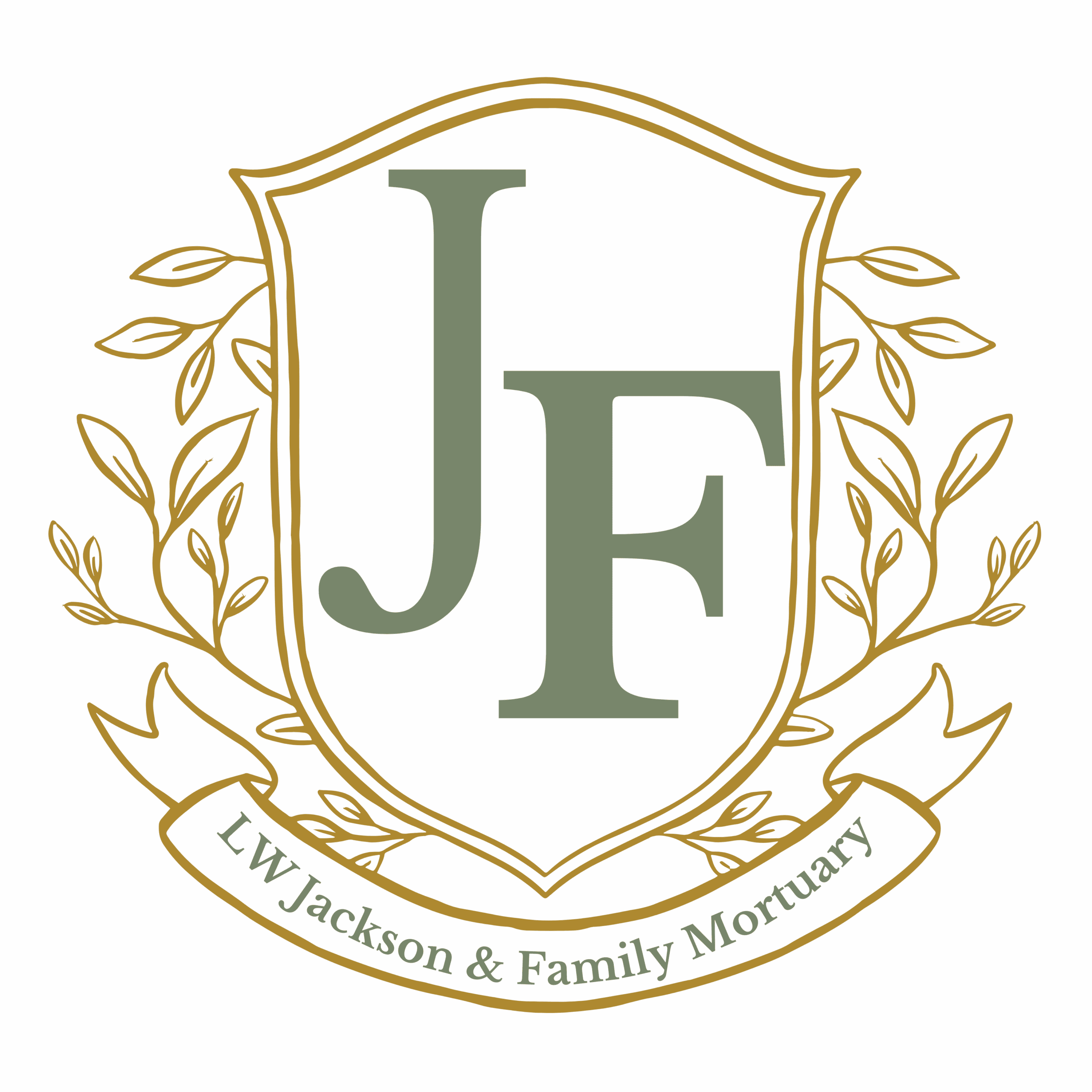 Crest logo with initials and decorative leaves.