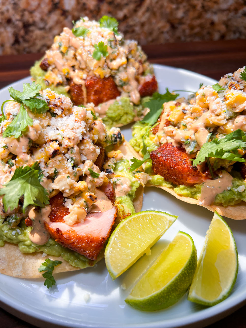 - Crunchy base: Crispy corn tortillas hold smashed avocado, well-spiced salmon, and piled-on esquites for textural contrast.