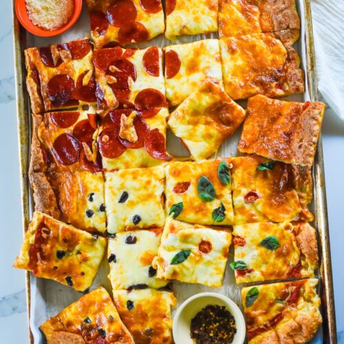 Size – You can reduce the ingredients easily to create a half or quarter sheet pan pizza recipe or tray bake. I use this full sheet pan for pizza. Here are half-sheet pan and quarter-sheet options.