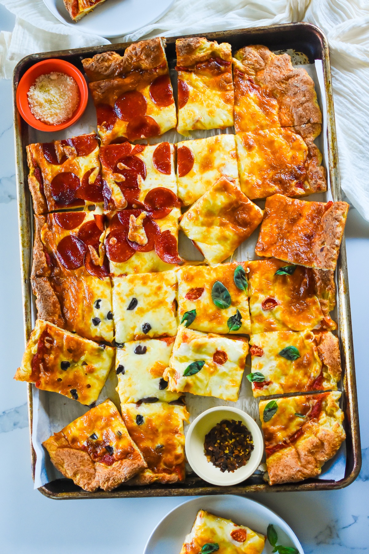 Size – You can reduce the ingredients easily to create a half or quarter sheet pan pizza recipe or tray bake. I use this full sheet pan for pizza. Here are half-sheet pan and quarter-sheet options.