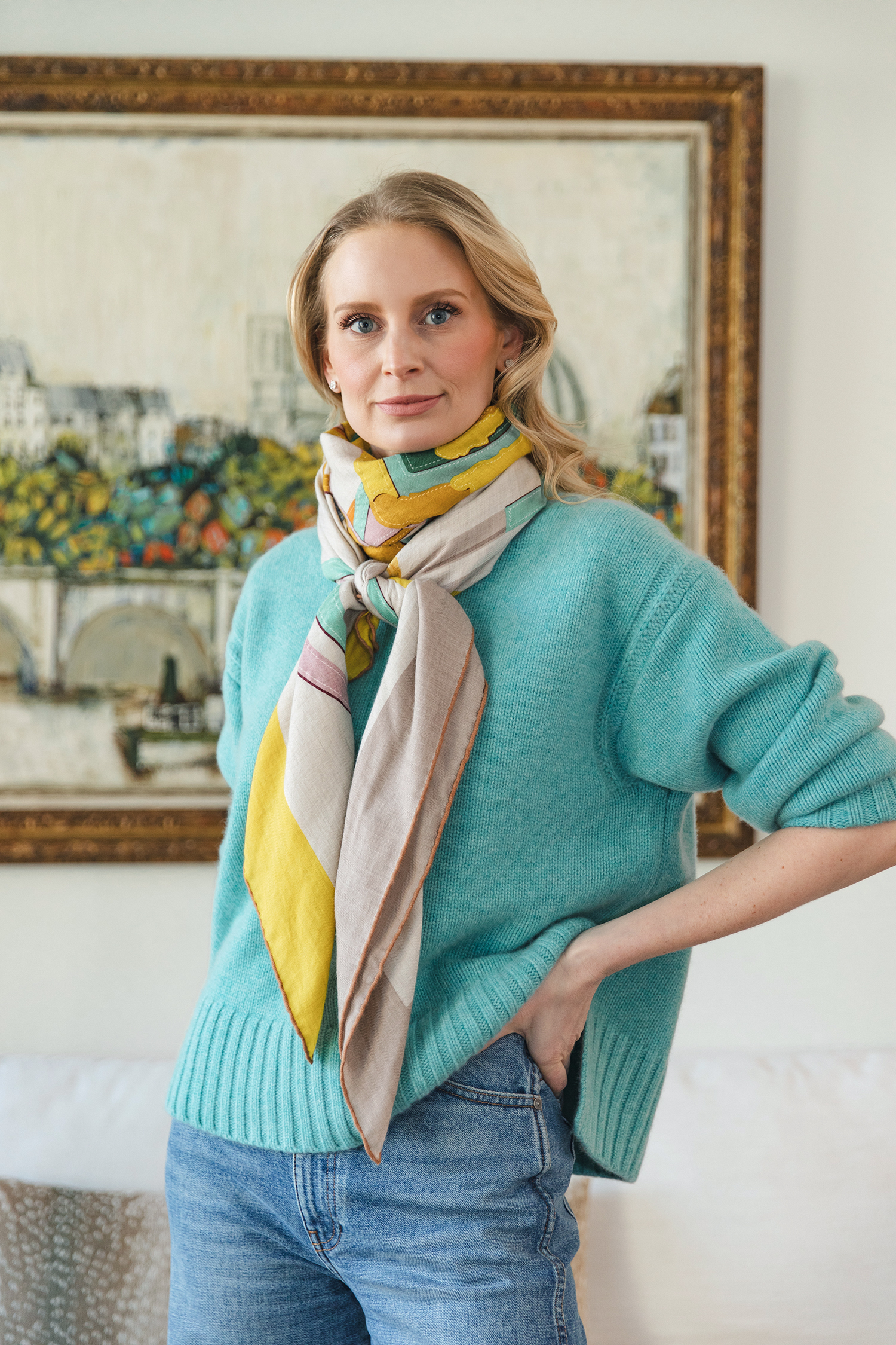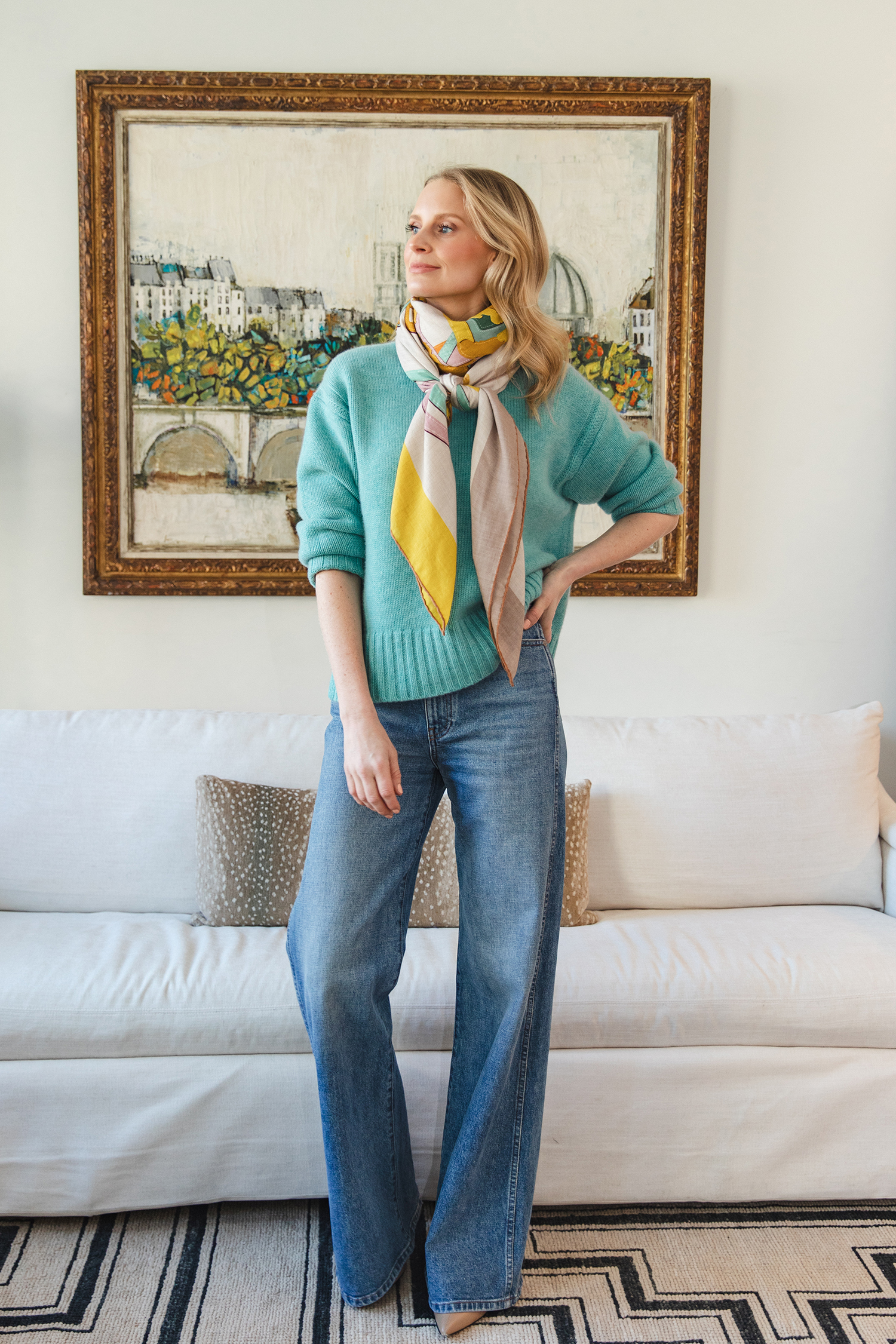 This time of year I am always reaching for a bright sweater! Just as the winter is getting on my last nerve and spring feels juuuuust within reach, I like to ditch the dark neutrals for more colorful fare. I’ve had a lot of fun this season especially, styling my favorite vivid knits with my collection of multi-color Hermès cashmere scarves. I recently figured out the PERFECT low effort way to wrap my scarves for maximum impact, and have been wearing this look on repeat by mixing and matching all of my scarves and sweaters! I shared a tutorial on how I achieved this wrapped look here – it’s so easy to do and makes this oversized cashmere scarf much more manageable. It has a lot of fabric, so this wrapping technique tames it a bit… plus, I love how it offers just a punch of color and eye-catching print without overwhelming the look.