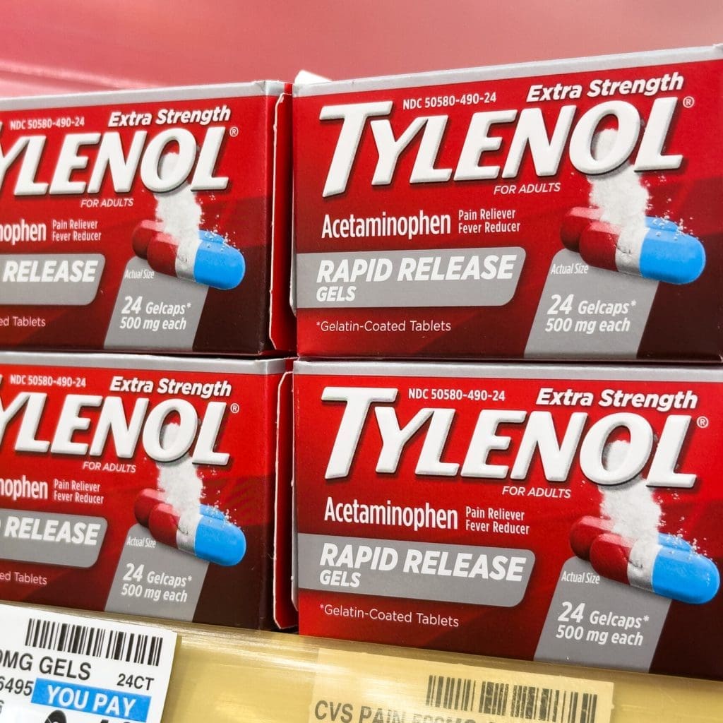 Boxes of Tylenol Extra Strength Rapid Release Gels, a pain reliever and fever reducer, are neatly arranged on the shelves of a CVS retail pharmacy store. (Kenishirotie/Adobe Stock)