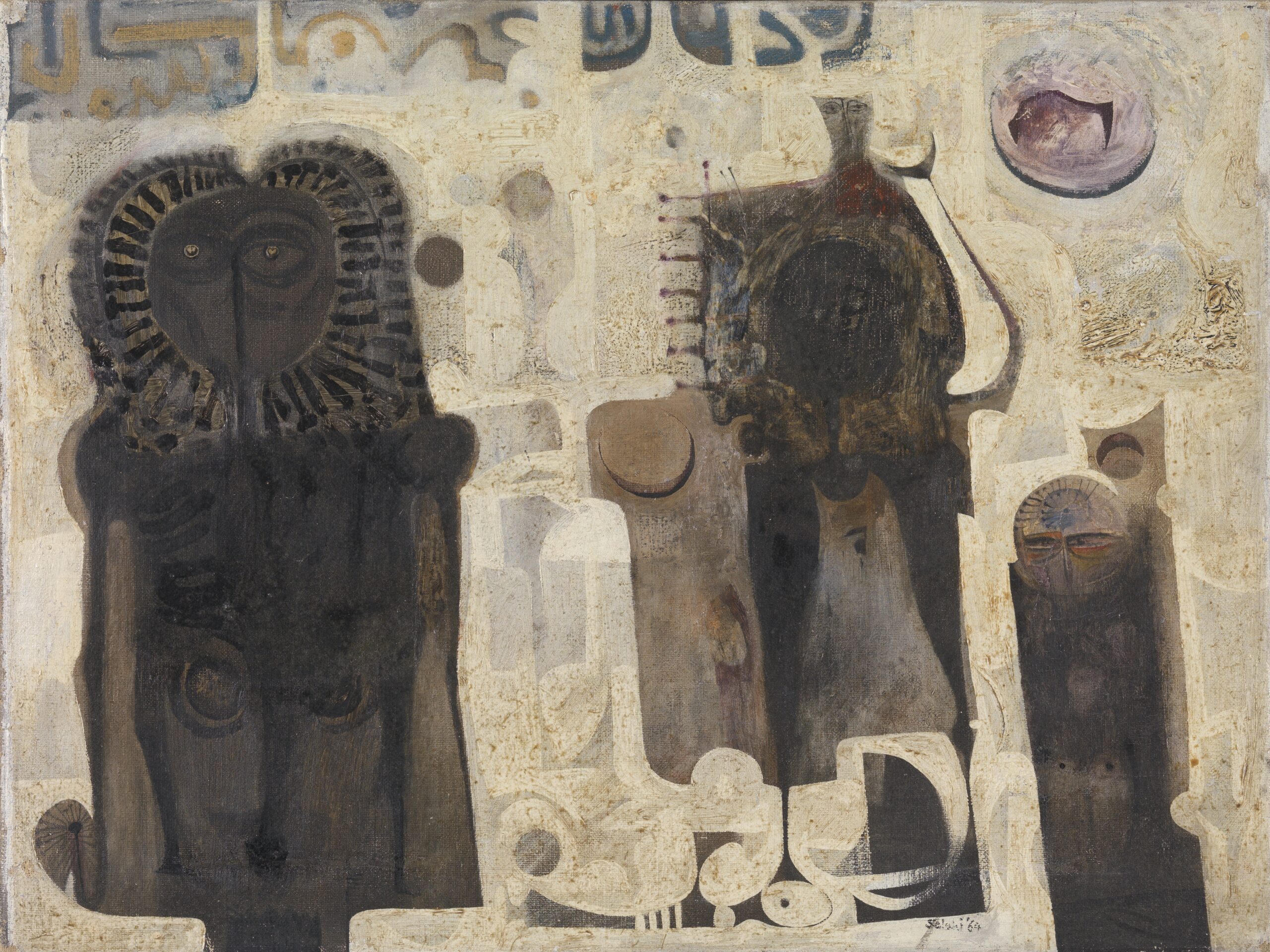 IBRAHIM EL-SALAHI (b. 1930), “They Always Appear,†1964 (oil paint on canvas, support: 610 × 460 mm; frame: 505 × 656 × 58 mm). | © Ibrahim El-Salahi. Tate Collection, Purchased from the artist with funds provided by the Africa Acquisitions Committee and Tate International Council 2016