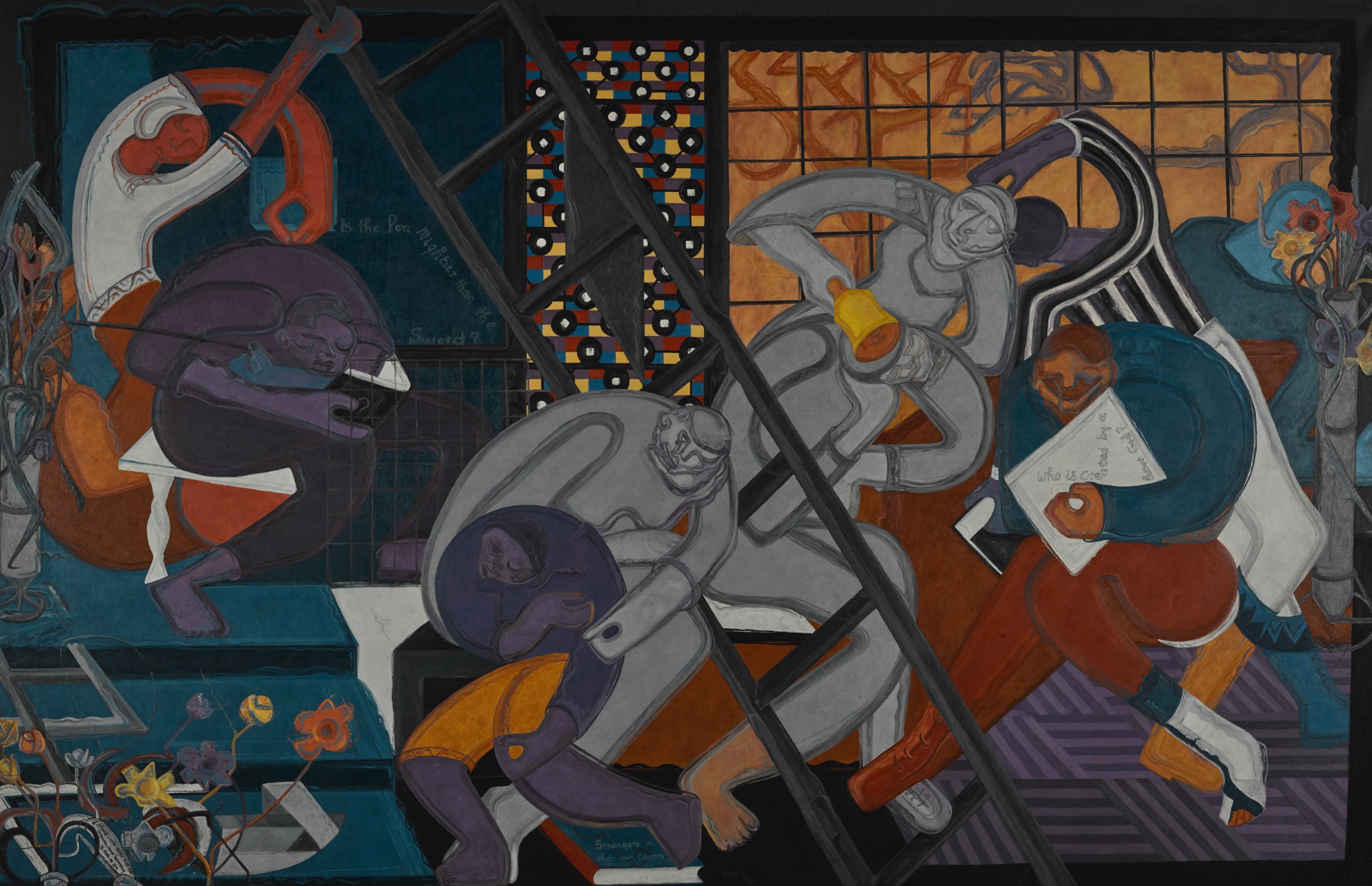 UZO EGONU (1931-1996), “Will Knowledge Safeguard Freedom 2,†1985 (oil on canvas, 178 x 274.5 cm / 70.1 x 108.1 inches). | © Estate of Uzo Egonu. Tiana and Vikram Chellaram