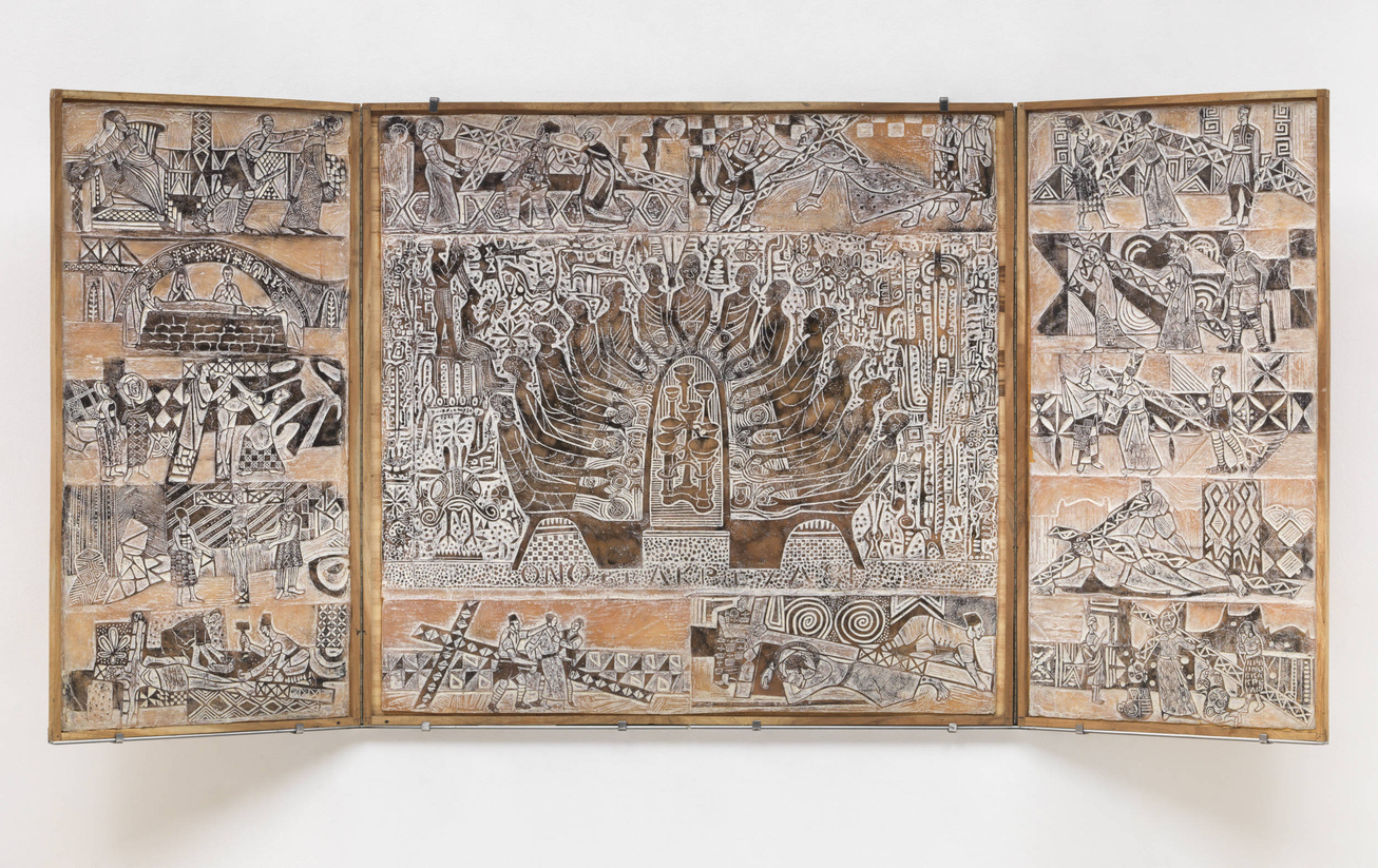 BRUCE ONOBRAKPEYA (b. 1932), “The Last Supper,†1981 (resin, wood, metal and paint, 1200 x 2515 x 25 mm). | © Reserved. Tate Collection. Purchased with funds provided by the Africa Acquisitions Committee, 2019