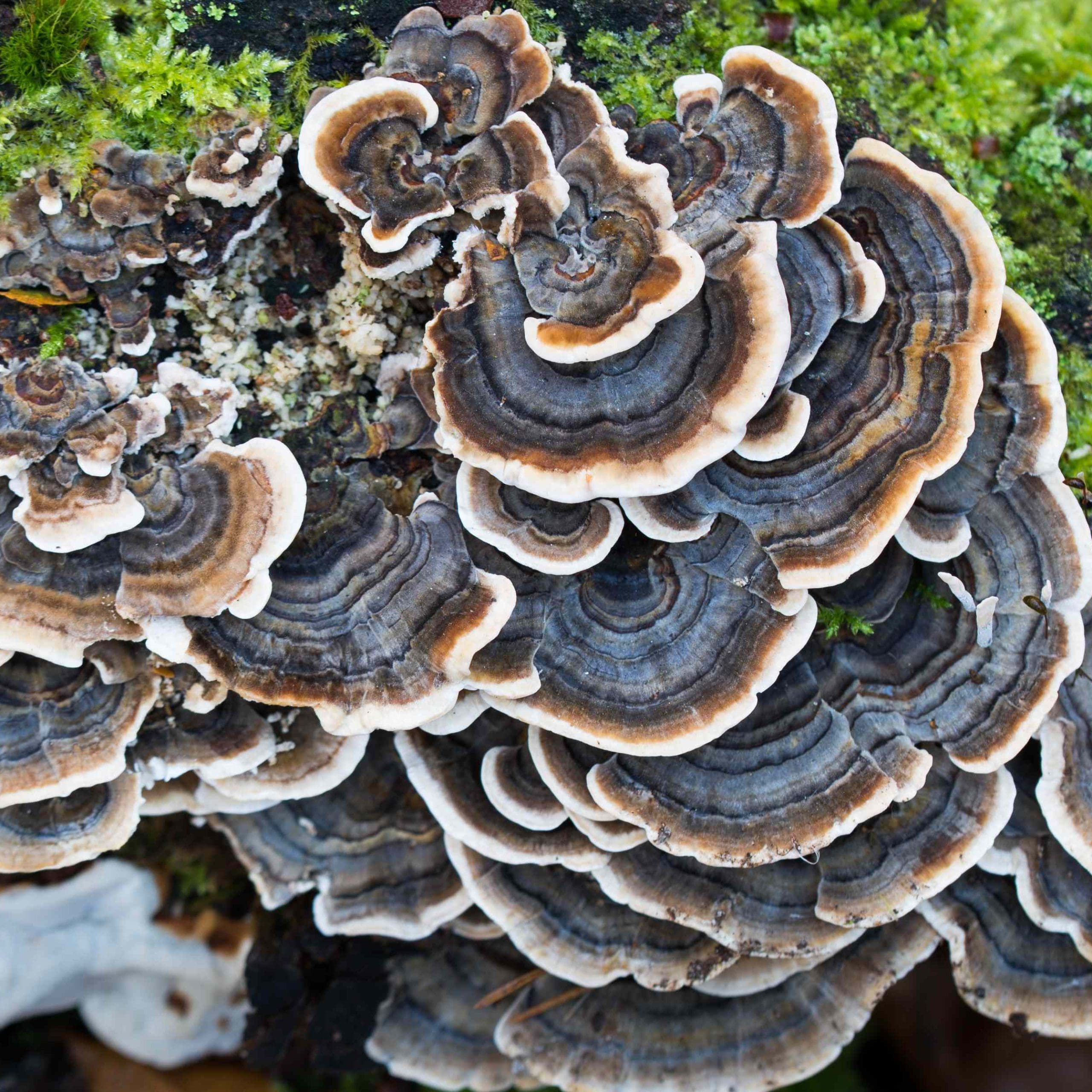 Turkey tail mushrooms are known for the bands of color on their caps, with the lightest color found on the margin. Be cautious since it can be hard to distinguish turkey tail mushrooms from some inedible mushrooms.