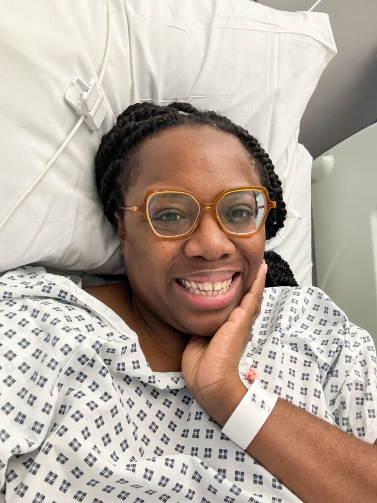 Kristabel wearing a hospital gown and smiling in hospital after her NHS open myomectomy