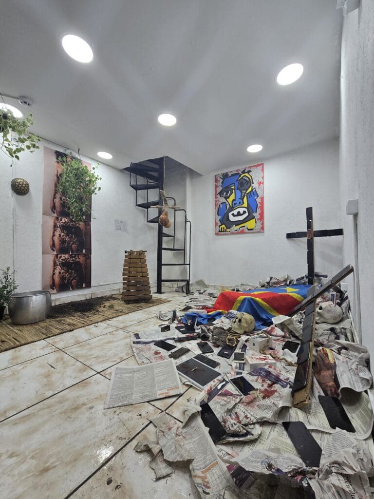 “This installation begins with its title—an intentional weaving of voices, chants, and incantations. It references the labor of Congolese miners in Goma, the mass protests for policy reform in Brazil, and the deep wisdom carried through Ifá cosmology, which continues to resonate across the Diaspora and beyond. As visitors step inside the circular structure, they are called into communion with these layers. The space invites gathering, meditation, reflection, and the imagining of new possibilities.